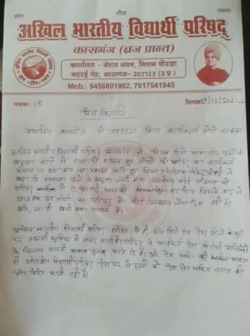 कासगंज: अखिल भारतीय विद्यार्थी परिषद (#ABVP) कासगंज ने खंडन किया कार्यकर्ता होने का दावा। तेजेन्द्र लोधी जिला संयोजक ABVP