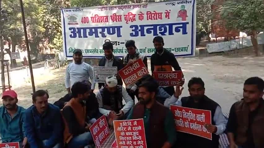इविवि में बीते सोमवार को हुए भारी हिंसा,आगजनी केबाद अपने अनशन स्थल पर छात्र नेताओ ने अपनी मांग को लेकर गुहार लगाते हुए।