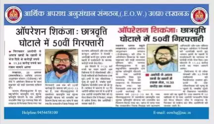 #Operation Shikanja जनपद गौतमबुद्वनगर में वित्तीय वर्ष 2012-13 में दशमोत्तर छात्रवृत्ति एवं शुल्क प्रतिपूर्ति योजना के अन्तर्गत करीब 12 करोड़ के छात्रवृति घोटाले में वांछित अभियुक्त चन्द्रमणि सिंह को लखनऊ से गिरफ्तार किया गया। Helpline number 9454458100