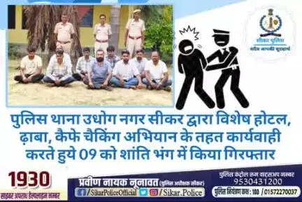 #सीकर 🔸पुलिस थाना उधोग नगर सीकर द्वारा विशेष होटल, ढ़ाबा, कैफे चैकिंग अभियान के तहत कार्यवाही करते हुये 09 को शांति भंग में किया गिरफ्तार #थाना_उद्योगनगर #TeamSikarPolice