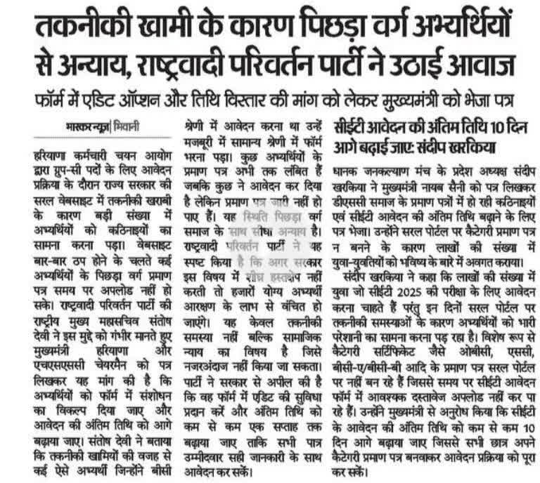 "तकनीकी खामी के कारण पिछड़ा वर्ग अभ्यर्थियों व अन्य से अन्याय, राष्ट्रवादी परिवर्तन पार्टी ने उठाई आवाज" #CET #2025