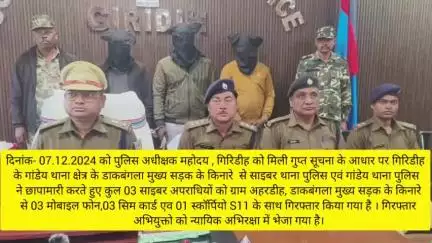 दिनांक- 07.12.2024 को पुलिस अधीक्षक महोदय , गिरिडीह को मिली गुप्त सूचना के आधार पर साइबर थाना पुलिस एवं गांडेय थाना पुलिस ने छापामारी करते हुए कुल 03 साइबर अपराधियों को ग्राम अहरडीह, डाकबंगला मुख्य सड़क के किनारे से गिरफ्तार किया गया ।