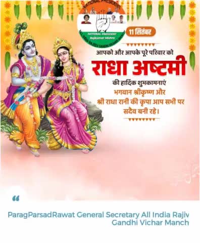 आप सभी देशवासियों मित्रों को परिवार सहित राधा अष्टमी कि अनंत् हार्दिक शुभकामनाएं बधाई। पराग प्रसाद रावत राष्ट्रीय महासचिव अखिल भारतीय राजीव गांधी विचार मंच