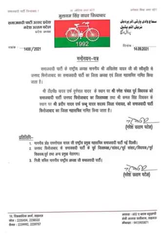 समाजवादी पार्टी ने फिरोजाबाद में जिलाध्यक्ष और जिला महासचिव को बदला, रमेश चंचल को जिलाध्यक्ष झब्बू यादव को महासचिव बनाया