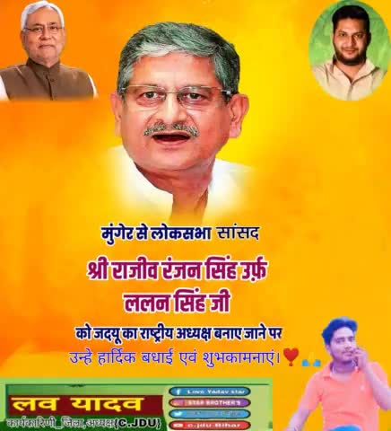 मुंगेर से #लोकसभा_सांसद आदरणीय श्री ललन सिंह जी को जनता दल यूनाइटेड के #राष्ट्रीय_अध्यक्ष बनाए जाने पर उन्हें बधाई।❣️🙏