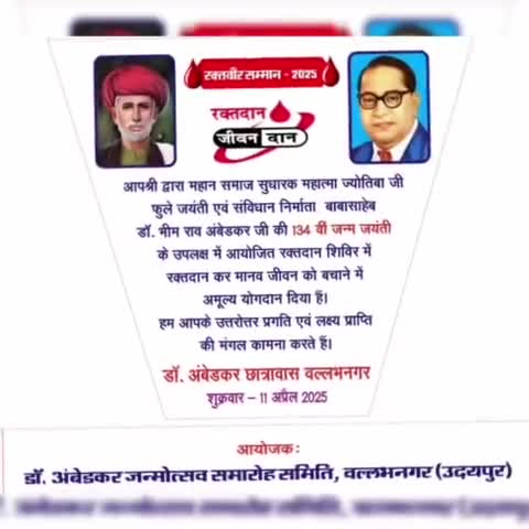 विशाल रक्तदान शिविर 11 अप्रेल 2025 को वल्लभनगर स्थित अम्बेडकर छात्रवास भटेवर रोड,,, रक्तदान कर पुण्य प्राप्त करे।।