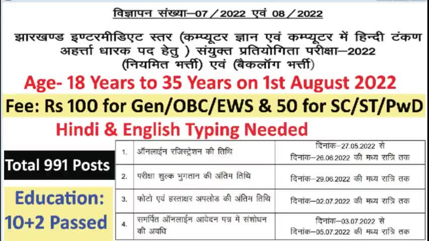 इंटर पास छात्रों के लिए झारखंड में निकली बहाली। कूल 991 पद। Visit: RKM4U on YouTube. #job #job2022