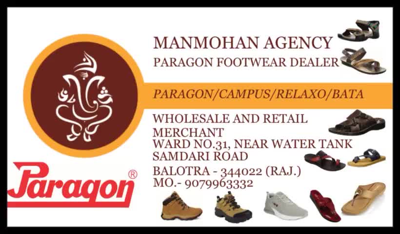 अपने शहर बालोतरा में शुज, चप्पल,सिलीपर आदि अब पेरागान लेना है तो मन मोहन एजेंसी बालोतरा, सेवा का मौका जरूर दें.......