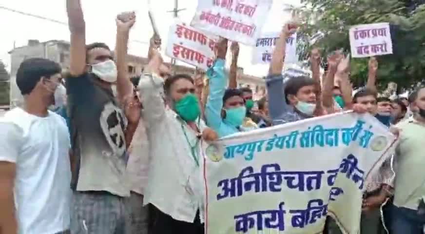 जयपुर: जयपुर डेयरी प्लांट में ठप हुआ दूध प्रोसेसिंग का कार्य, पीसीसी के बाहर जयपुर डेयरी संविदाकर्मियों ने किया प्रदर्शन