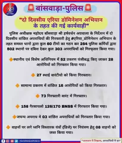 पुलिस अधीक्षक महोदय के निर्देशन में दो दिवसीय वांछित अपराधियों की गिरफ्तारी हेतु #एरिया_डोमिनेशन अभियान के तहत समस्त थानो द्वारा कुल 60 टीमो का गठन कर 264 पुलिस कर्मियों द्वारा 502 स्थानो पर दबिश देकर कुल 303 आरोपियों को किया गिरफ्तार।