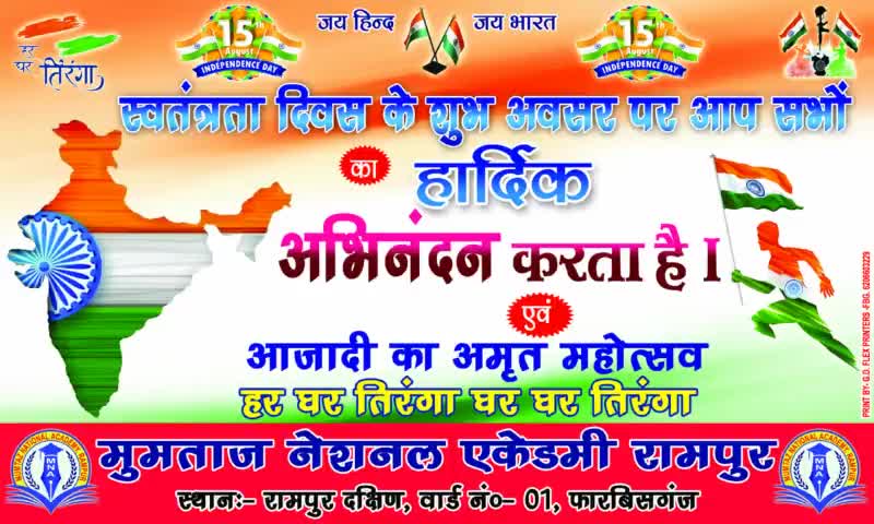 फारबिसगंज :ममताज नेशनल अकैडमी रामपुर की तरफ से स्वतंत्रता दिवस के शुभ अवसर पर बिहार एवं देशवासियों को हार्दिक शुभकामनाएं #नौशाद अहमद