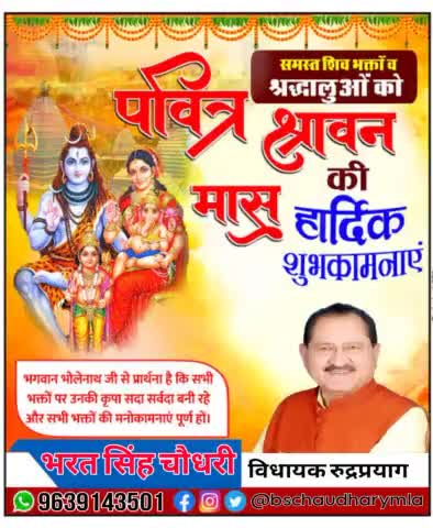 ॐ नमः शिवाय। समस्त शिवभक्तों को आज पवित्र श्रावण मास शुभारंभ होने के साथ ही प्रथम सोमवार की हार्दिक शुभकामनाएं। भगवान भोलेनाथ की कृपा आप सभी पर सदा बनी रहे।