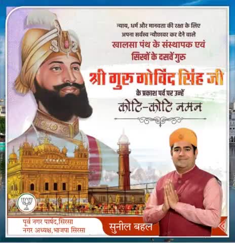 न्याय, धर्म और मानवता की रक्षा के लिए अपना सर्वस्व न्योछावर कर देने वाले खालसा पंथ के संस्थापक एवं सिखों के दसवें गुरु श्री गुरु गोविंद सिंह जी के प्रकाश पर्व पर उन्हें कोटि-कोटि नमन 🙏