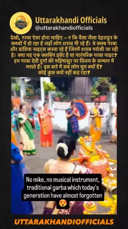 देखो, गरबा ऐसा होना चाहिए — न कि वैसा जैसा देहरादून के क्लबों में हो रहा है जहाँ लोग शराब पी रहे हैं। ये क्लब गरबा और डांडिया नाइट्स करवा रहे हैं जिनमें शराब परोसी जा रही है।