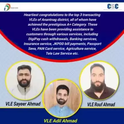 Heartiest congratulations to the top 3 transacting VLEs of Anantnag district, all of whom have achieved the prestigious A+ Category. These VLEs have been providing assistance to customers through various services.