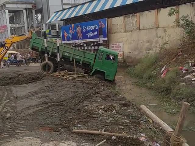 #जबलपुर मदन महल अंडर ब्रिज के पास नाले में घुसा ट्रक से बड़ी मुश्किल से निकाला गया