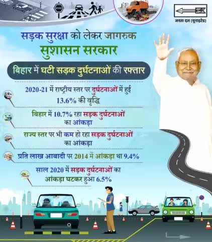 नीतीश जी की सरकार ने सड़क सुरक्षा को लेकर कई अहम कदम उठाए हैं जिससे सड़क पर हो रही दुर्घटनाओं में काफी कमी आयी है। राष्ट्रीय औसत के मुकाबले राज्य में सड़क दुर्घटनाओं के औसत में काफी कमी आयी है और साल दर साल दुर्घटनाओं का आंकड़ा घटता जा रहा