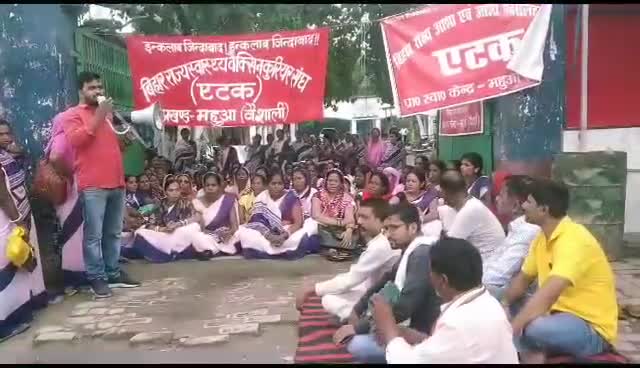 अशा संघ द्वारा जारी अनिश्चितकालीन धरना के समर्थन में महुआ पीएचसी गेट पर आंदोलनकारियों को संबोधित किया~ प्रकाश प्रियदर्शी