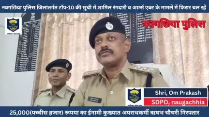 नवगछिया पुलिस जिलांतर्गत टॉप-10 की सूची में शामिल रंगदारी व आर्म्स एक्ट के मामलें में फिरार चल रहें 25,000(पच्चीस हजार) रूपया का ईनामी कुख्यात अपराधकर्मी ऋषभ चौधरी गिरफ्तार। इस संबंध में विस्तृत जानकारी देते हुए श्री ओम प्रकाश अनुमंडल पुलिस