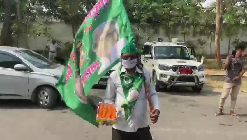 आरजेडी समर्थक पटना में अनेक तरह से अपने नेता लालू यादव के लिए मिठाई और पार्टी के झंडे के साथ आवास पर पहुंच रहे है।