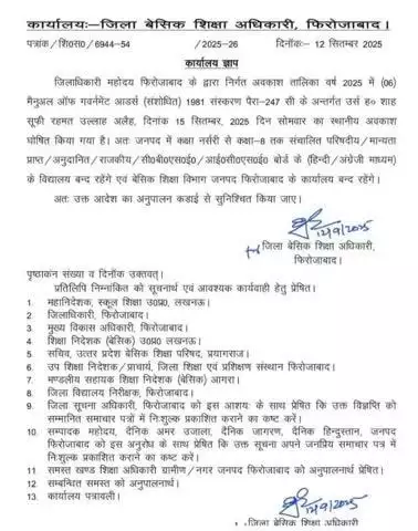 जिलाधिकारी के आदेशानुसार कल 15 सितम्बर 2025 को उर्स हजरत शाह सूफी रहमतुल्लाह अलैह के अवसर पर स्थानीय अवकाश घोषित। सभी परिषदीय, मान्यता प्राप्त, अनुदानित, राजकीय, CBSE, ICSE बोर्ड के विद्यालय नर्सरी से कक्षा-8 तक हिंदी/अंग्रेजी माध्यम सहित ब