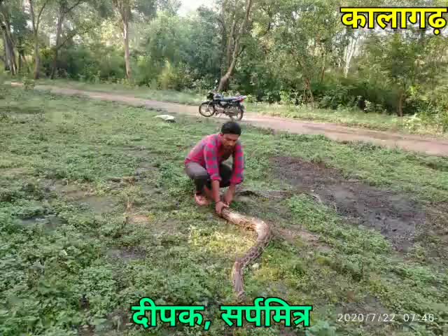 धामपुर: कालागढ़ में विशालकाय अजगर को पकड़कर जंगल में छोड़ती टीम। सर्पमित्र दीपक ने कालगढ़ से सांप को पकड़कर जंगल में छोड़ा।