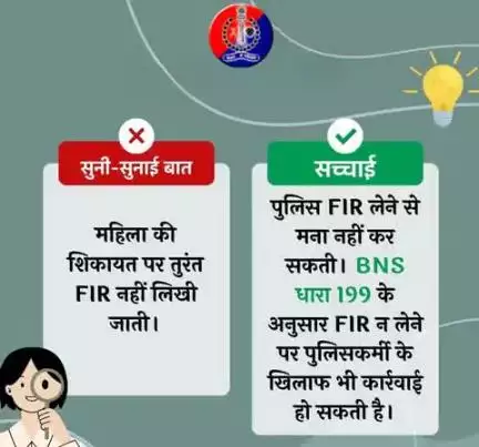 सुनाई-सुनाई बातों पर विश्वास न करें, सच जानें! महिला की शिकायत पर पुलिस FIR लेने से मना नहीं कर सकती। BNS 2023, धारा 199 के अनुसार FIR न लेने पर पुलिसकर्मी के खिलाफ भी कार्रवाई संभव है।