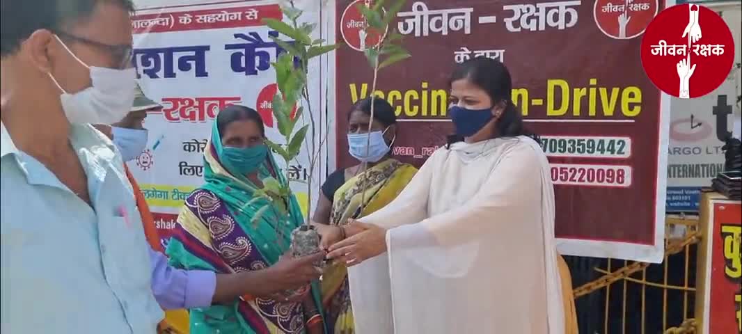 मास्क पहनने और वैक्सीन लेने के लिए जागरूकता अभियान चलाते हुए जीवन-रक्षक की टीम। इस मौके पर पौधों का भी वितरण किया गया।