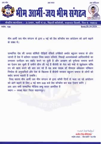 भीम आर्मी जय भीम राष्ट्रीय अध्यक्ष मनजीत सिंह नौटियाल 4 मई शाम 5 बजे प्रैस कॉन्फ्रेंस कर जिला सहारनपुर कस्बा बेहट में आंदोलन को आगे बढ़ाने के लिए बड़ा ऐलान करेंगे। अतः आप सभी सम्मानित मिडिया बन्धु सादर आमंत्रित हैं।