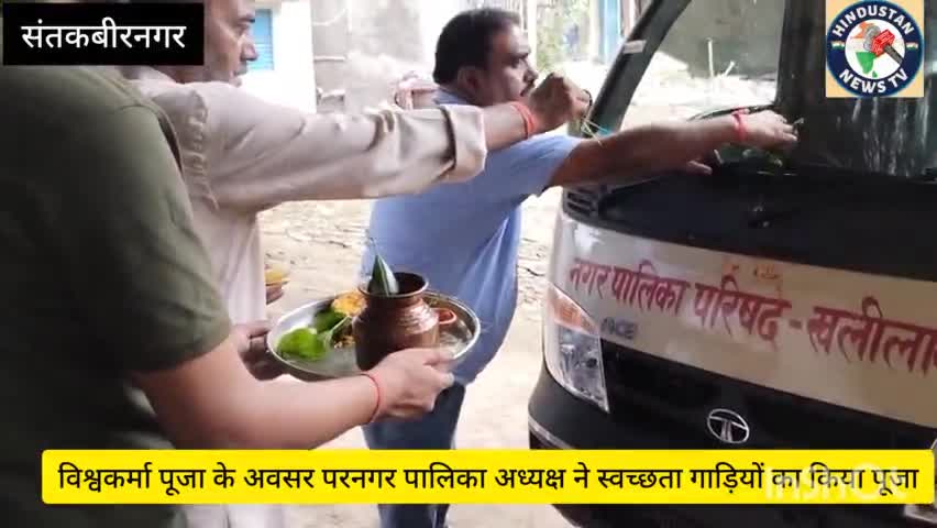 विश्वकर्मा पूजा के अवसर पर नगर पालिका अध्यक्ष जगत जायसवाल ने सभी स्वच्छता वाहनो का विधि विधान से किया पूजा बांटा प्रसाद