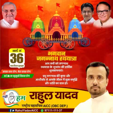 भगवान श्री जगन्नाथ जी की रथ यात्रा के पावन अवसर पर समस्त देशवासियों को हार्दिक शुभकामनाएं। प्रभु जगन्नाथ, बलभद्र जी, माँ सुभद्रा सभी भक्तों को सुख-समृद्धि व आरोग्य प्रदान करें।