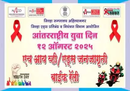जिल्हा एड्स प्रतिबंध आणि नियंत्रण विभाग अंतर्गत आंतरराष्ट्रीय युवा दिन 12 ऑगस्ट 2025 रोजी जनजागृती मोहीम बाईक रॅली काढण्यात येत आहे