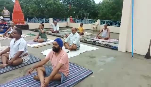 हनुमान मंदिर बेहटा चौराहा में सभी लोग योगाभ्यास करते हुए।