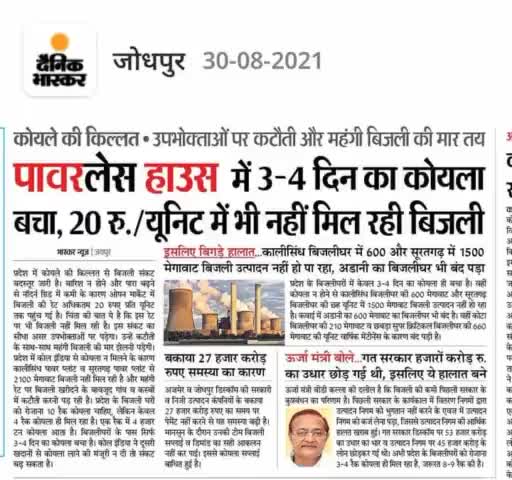 आगे आने वाले दिनो मे बिजली ग्रामीण क्षेत्र में 5 या 6 घण्टे कटौती की जा सकती है कोयले की आपूर्ति नही हुई तो
