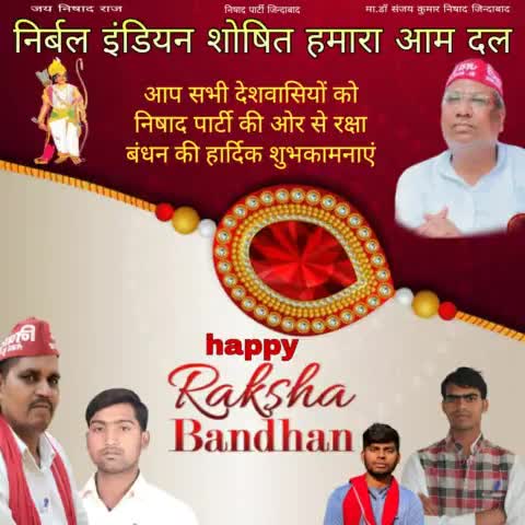 आप सभी देशवासियों रक्षाबंधन के पावन पर्व पर ढेरों शुभकामनाएं! जय निषाद राज... निषाद पार्टी- जिन्दाबाद जिन्दाबाद !!