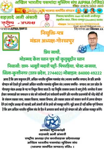 अखिल भारतीय पसमांदा मुस्लिम संघ (भाजपा-समर्पित-संगठन) के राष्ट्रीय अध्यक्ष एवं कार्यवाहक प्रदेशाध्यक्ष शहज़ादे अली अंसारी ने जनपद-कुशीनगर निवासी मोहम्मद कैश खान जी (पूर्व में जो 01 बार जिला पंचायत सदस्य रहे) को मंडल-अध्यक्ष गोरखपुर के पद पर