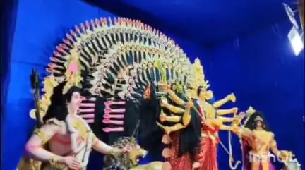 মায়ের প্রতিমায় অভিনব চমক! শত মুখের দেবীর প্রতিমায় ফুটে উঠেছে অনন্ত রূপের আভাস। আশ্রম প্রাঙ্গণে দেবীর এই অনন্য রূপে মুগ্ধ দর্শনার্থীরা। একই সাথে অখণ্ড হরিনাম শ্রবণের আবহে মায়ের আগমন ঘটেছে আশ্রমে। সারেঙ্গা ব্লকের খামানি জগদানন্দ সন্ন্যাস আশ্রমের দুর্গোৎসব এ বছর ভক্ত ও দর্শনার্থীদের কাছে বড় আকর্ষণ। কারণ, আশ্রম প্রাঙ্গণে বিরাজ করছেন শত মুখের দেবী প্রতিমা। গত বছর যেখানে সহস্রহাতের দেবী প্রতিমা সাড়া ফেলেছিল, এবছর সেই জায়গা নিয়েছে দেবীর শত মুখের অভিনব রূপ