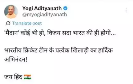 उत्तर प्रदेश के मुख्यमंत्री योगी आदित्यनाथ ने भारतीय टीम को जीत की बधाई दी
