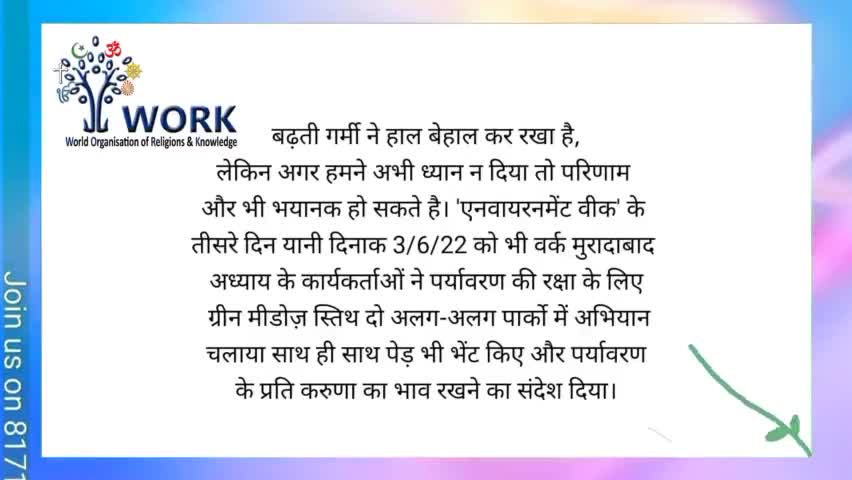एनवायरनमेंट वीक के तीसरे दिन सुबह 6 बजे वर्क मुरादाबाद के कार्यकर्ताओं ने अभियान का एक सत्र और चलाया अथवा पौधे भेट किये।