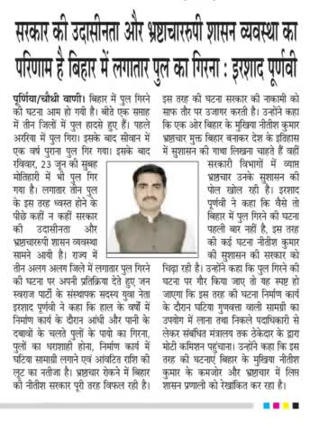 बिहार में जिस तरह से पुल गिर रही है ऐसा लग रहा है कि पुल बचाओ अभियान शुरू करना होगा