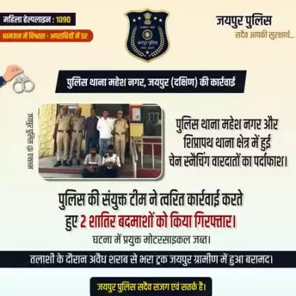 पुलिस थाना महेश नगर, जयपुर (दक्षिण) की कार्रवाई। महेश नगर व शिप्रापथ थाना क्षेत्र में हुई चेन स्नैचिंग वारदातों का पर्दाफाश। 2 शातिर बदमाश गिरफ्तार।