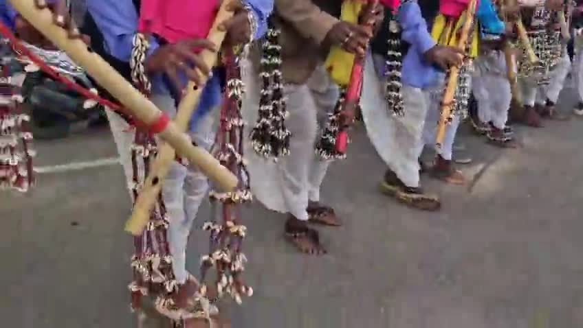 जिला स्तरीय आयोजन में प्राचीन गोठान परंपरा का पथ संचलन करते हुए आदिवासी संस्कृती के संरक्षक।