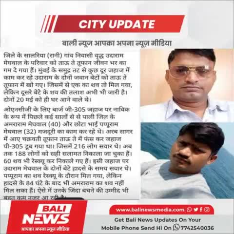 **जिले के सालरिया (रानी) गांव निवासी वर्द्ध उदाराम मेघवाल के परिवार के दोनों जवान बेटे ताऊ ते तूफान में खो गये