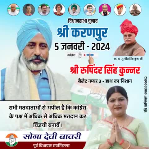 श्रीकरणपुर की जनता जनार्दन से विनम्र आग्रह। 🙏 श्रीकरणपुर के विकास एवं स्वाभिमान के लिए कल 5 जनवरी को बैलेट नंबर-3 दबाकर कांग्रेस प्रत्याशी बड़े भाई श्री रुपिंदर सिंह (रूबी) कुन्नर को अपना बहुमूल्य वोट दे