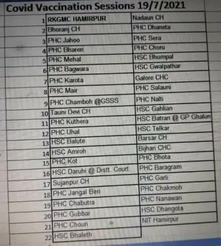Vaccination sessions 18+ & 45+ distt Hamirpur on dated 19/07/2021