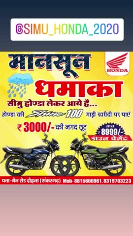 सिमु होंडा मानसून धमाका..होंडा की Shine100 गाड़ी की खरीदी पर पाए 3000 रुपए की नकद छूट...🙏👍 मो. न.- 9165955400