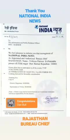 मुझे नेशनल इंडिया न्यूज़ राजस्थान स्टेट ब्यूरो चीफ बनाने पर सभी का तहे दिल से शुक्रिया एवं आभार #nationalindianews