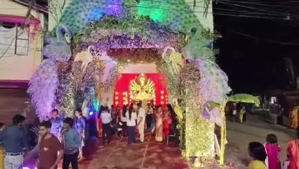 চাঁচল ২: অষ্টমীর রাতে উপচে পড়া ভিড়, মালদার চাঁচলের দক্ষিণপাড়া দুর্গা উৎসব কমিটির থিম ভাবনা অভয়ারণ্যে দুর্গা