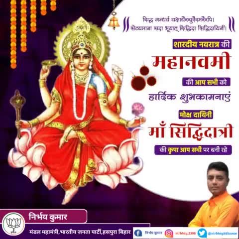 वन्दे वांछित मनोरथार्थ चन्द्रार्घकृत शेखराम्। कमलस्थितां चतुर्भुजा सिद्धीदात्री यशस्वनीम्॥ शारदीय नवरात्र की महानवमी की आप सभी को हार्दिक शुभकामनाएं। मोक्ष दायिनी माँ सिद्धिदात्री आप सभी की मनोकामनाएं पूर्ण करें, यही प्रार्थना है।