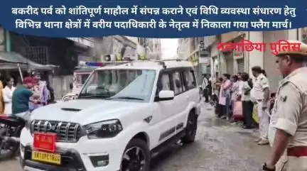 बकरीद पर्व को शांतिपूर्ण माहौल में संपन्न कराने एवं विधि व्यवस्था संधारण हेतु विभिन्न थाना क्षेत्रों में वरीय पदाधिकारी के नेतृत्व में निकाला गया फ्लैग मार्च।